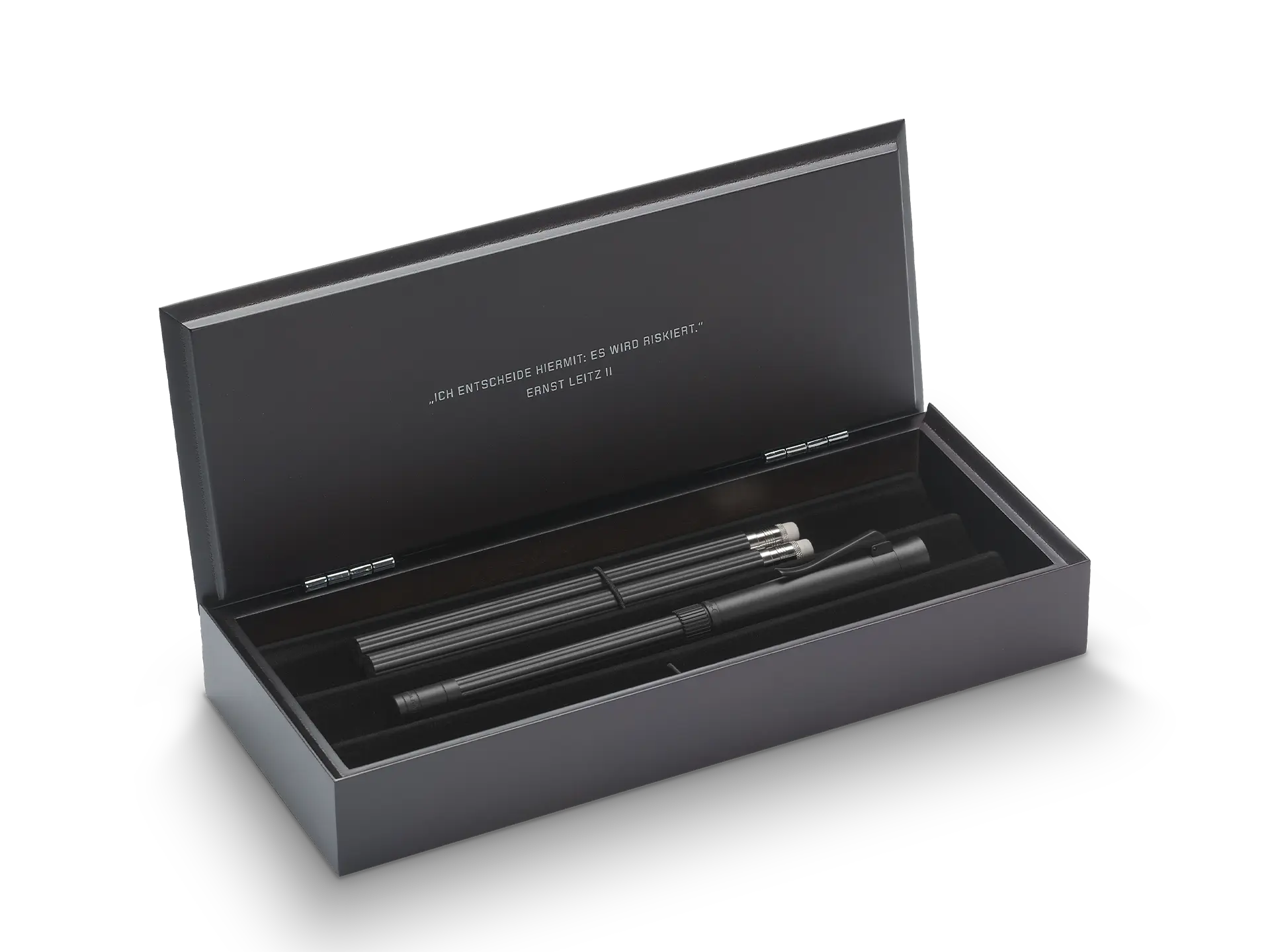 Housed in a wooden box, each set carries Ernst Leitz II’s famous words embossed on the wooden box, “Ich entscheide hiermit: Es wird riskiert” (“I hereby decide: We will take the risk”), marking a pivotal moment in Leica’s history.