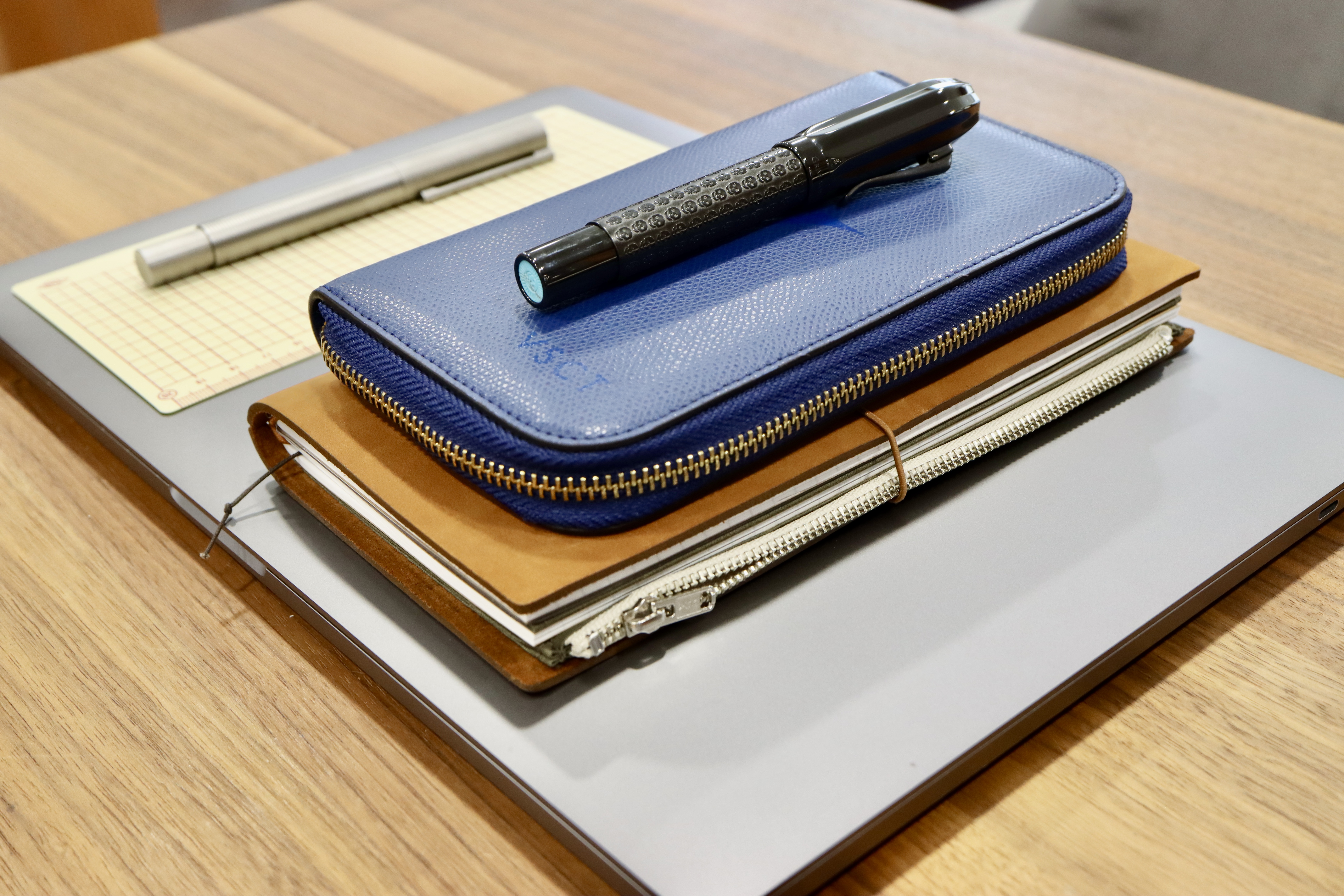 I really like this Visconti Pen Pouch for how fashionable it looks. It has room for three credit cards or business cards and three pens. As you can see from the photo, the pens I currently store inside are a Maiora Alpha Orogrigio, a Graf von Faber-Castell Pen of the Year 2022 “Aztecs” and a Bauhaus Otto Hutt design08.
